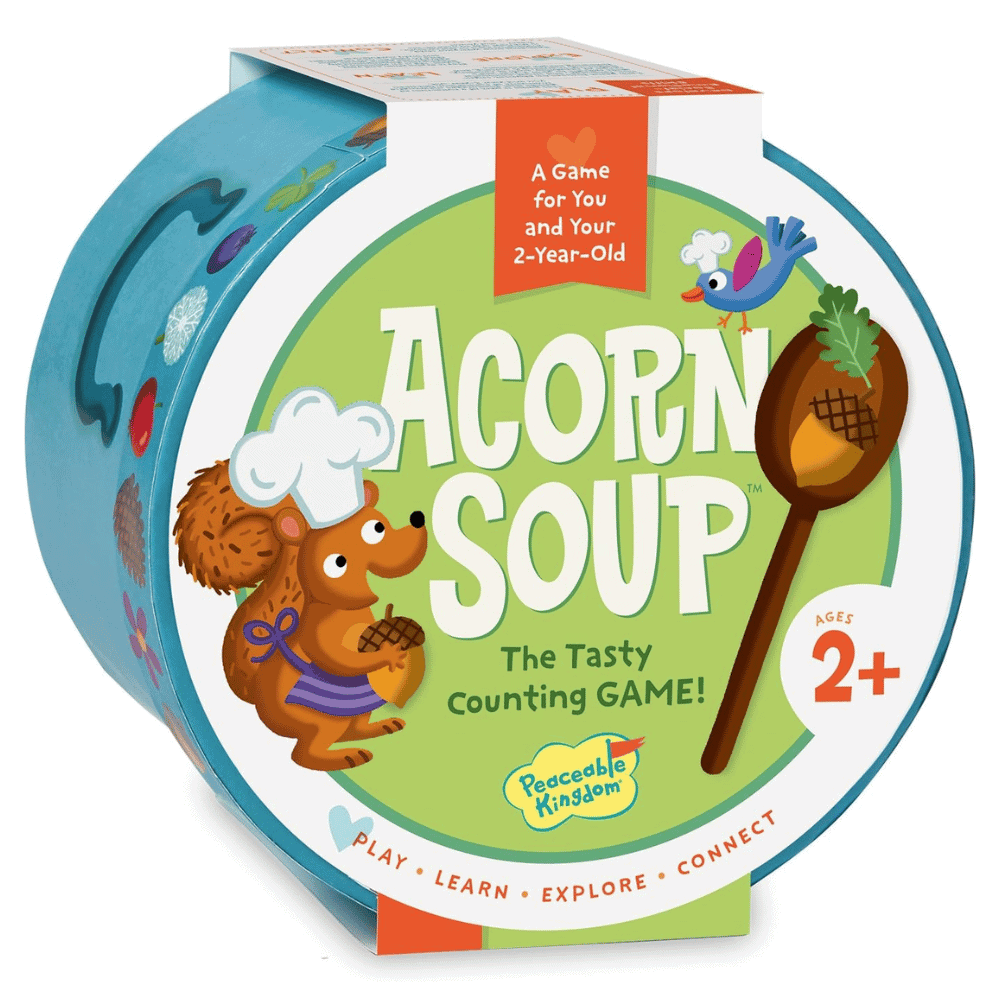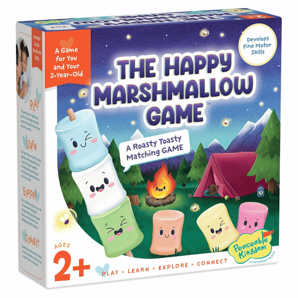 In this game, each player holds a marshmallow roasting stick and adds marshmallows by drawing matching cards. It’s a win-win game: Everyone wins when all the sticks are full, teaching toddlers about sharing and teamwork. Players then celebrate by “roasting” their sticks over a pretend fire.