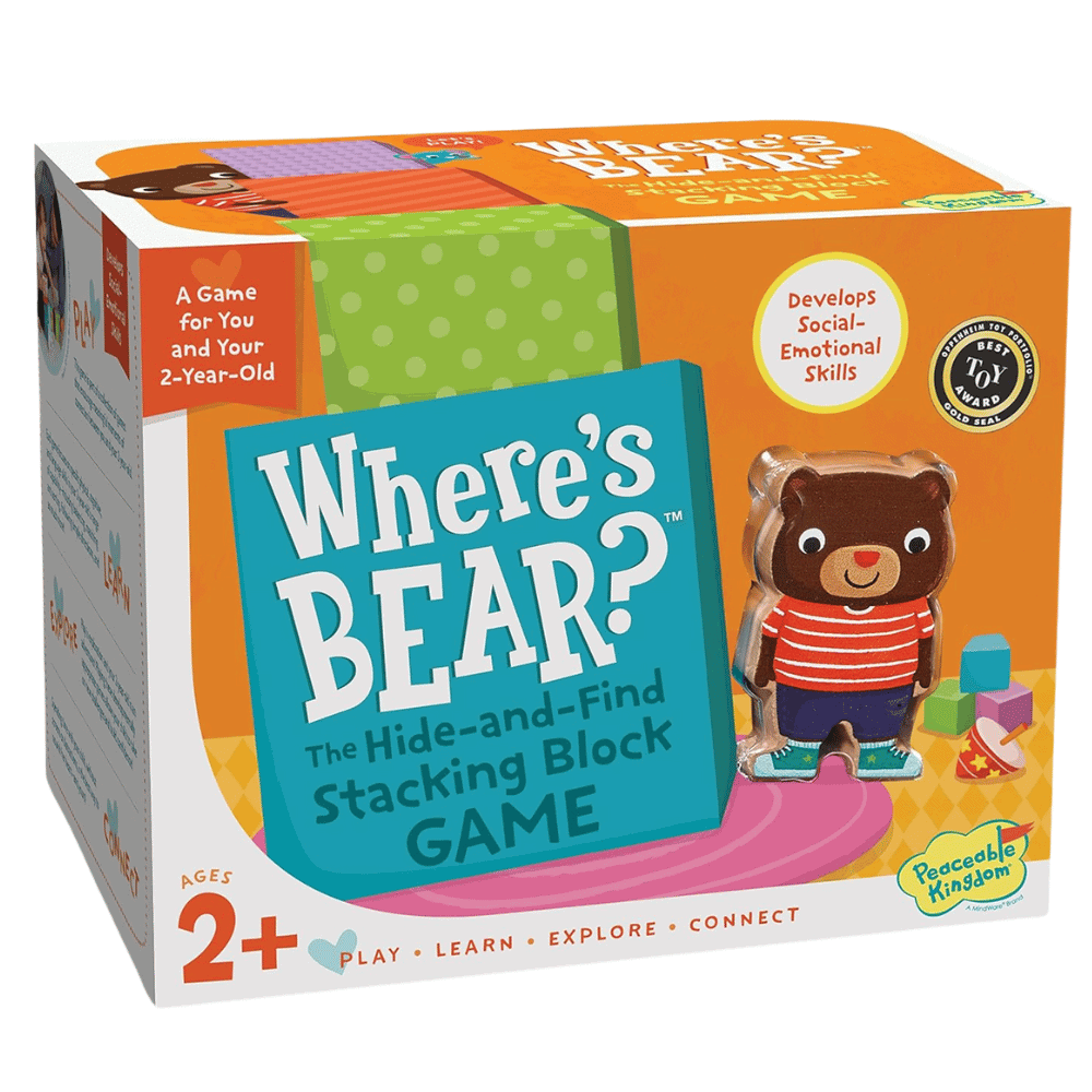 Where’s Bear is a fun mix of two favorite activities—stacking blocks and playing hide-and-seek! Parents and kids take turns hiding Bear under the sturdy nesting boxes (each a different room in his house) and then finding him.