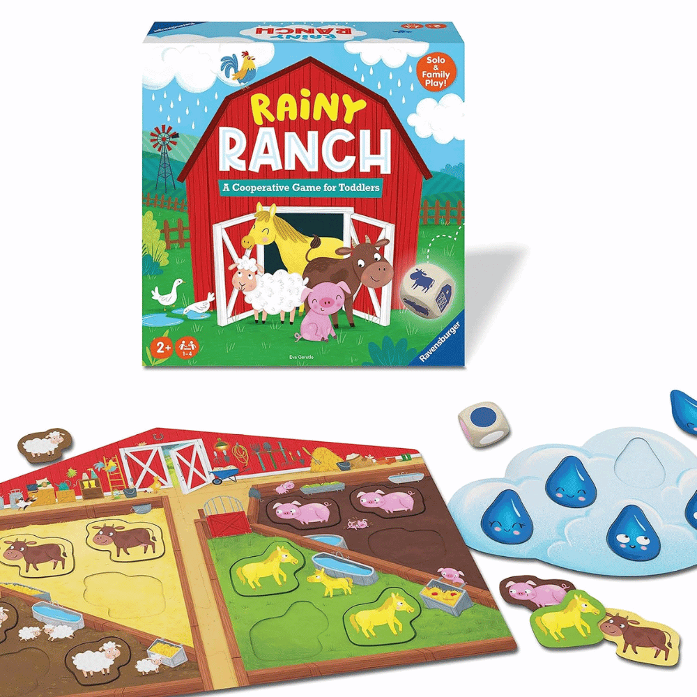 In this cooperative game, work together to move the animals into the barn before the rain! Roll the die to lead animals into the barn, watch out for raindrops, and get everyone safely inside before it rains. Toddlers will work on fine motor skills while learning to take turns and follow directions.