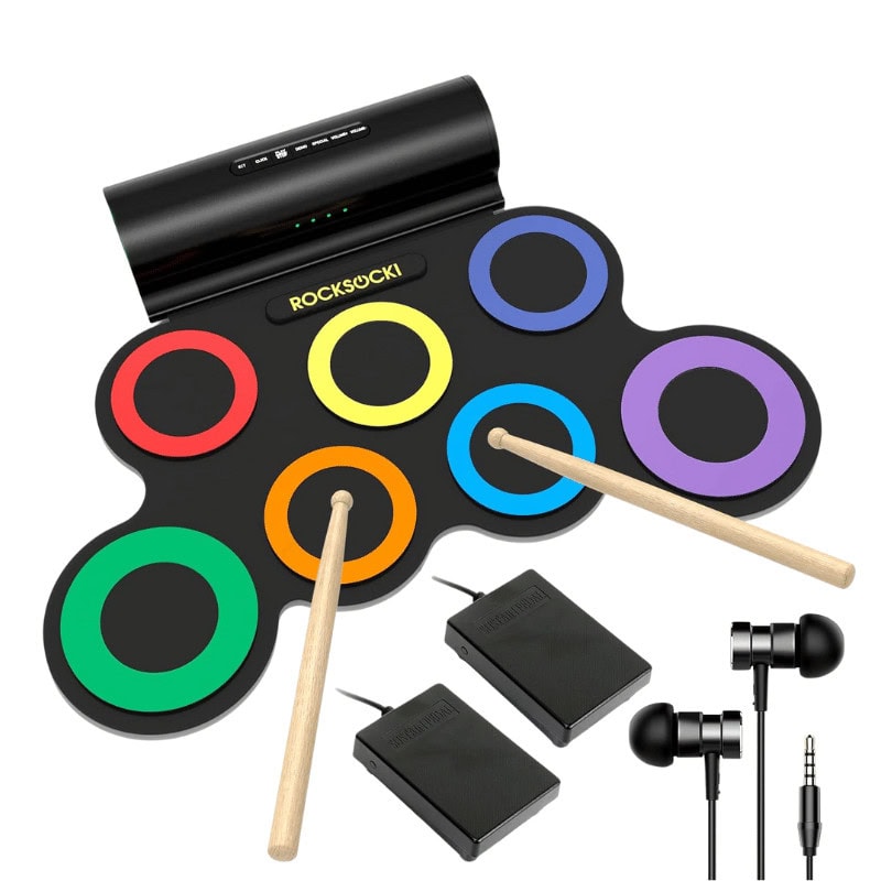 Everything a beginner drummer needs! Built-in speakers, adjustable volume, headphone mode, and a rechargeable battery. It even rolls up for easy storage.