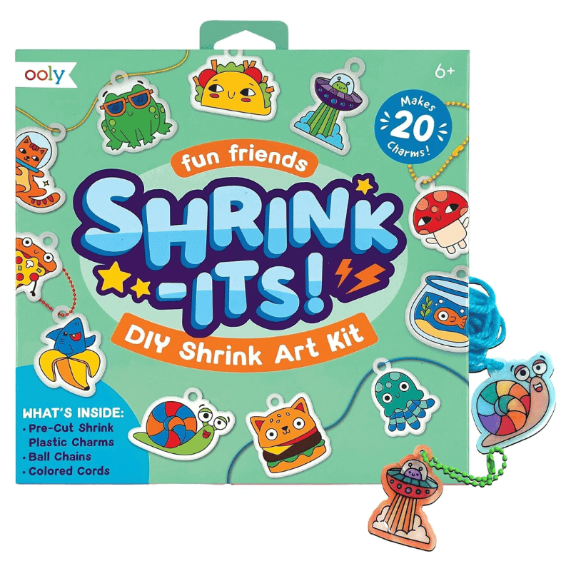 Create your own charms with this fun shrinking art kit. Color the designs, pop them in the oven, and watch them shrink into tiny charms, perfect for bracelets, backpacks, or keychains.