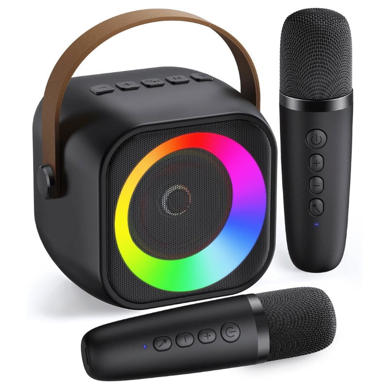 The smallest (and cutest!) karaoke machine ever! It comes with two mics, fun voice effects, Bluetooth streaming, and LED lights that dance to the music.