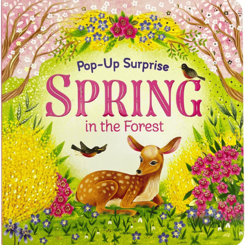Explore spring in the forest with this fun pop-up surprise board book! Follow a mama deer and her little fawn as they wander through the woods discovering birds singing, wildflowers blooming, raindrops splashing in puddles, and a rainbow shining in the sky.