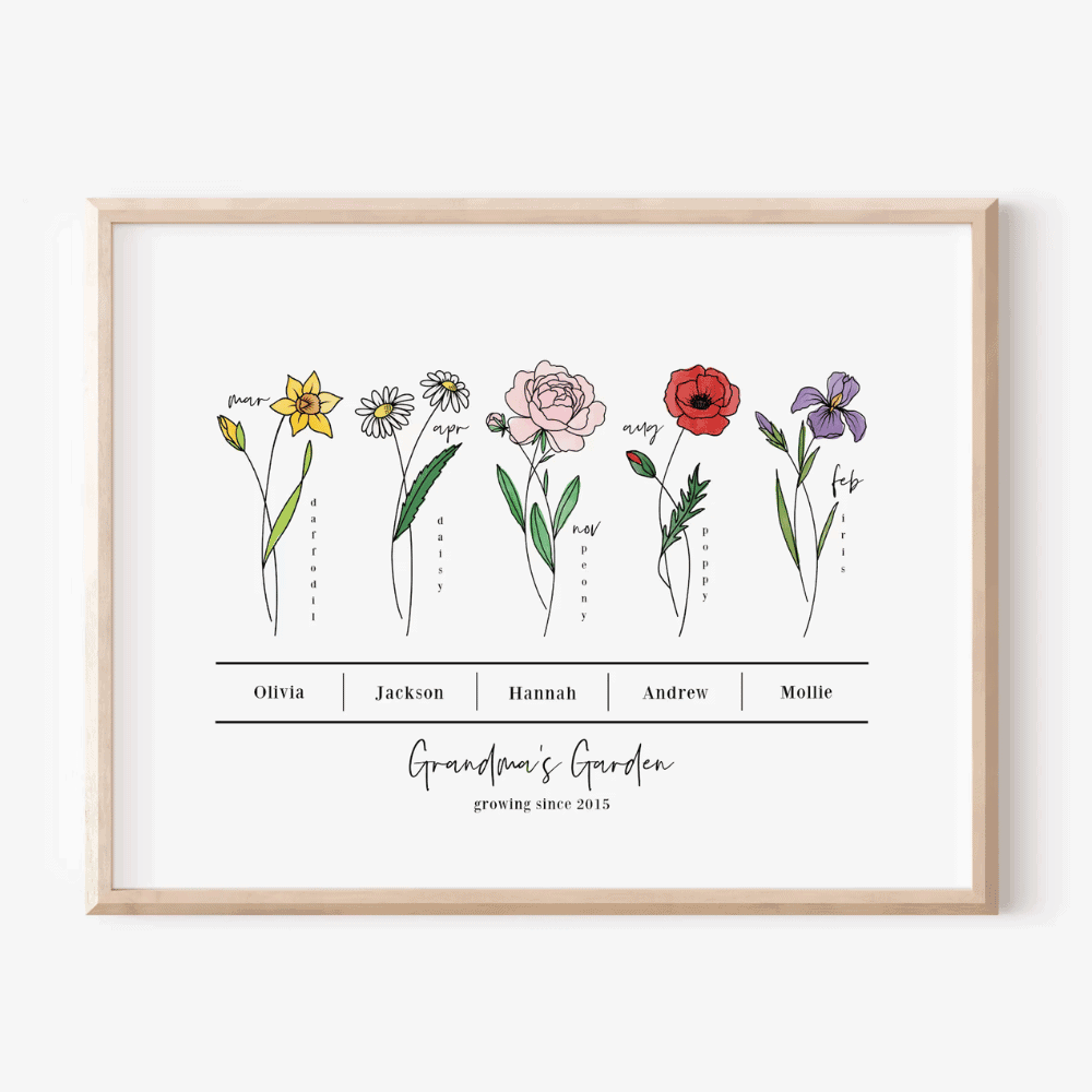 Give grandma a floral art print personalized with up to six names and birth flowers representing her grandchildren. An affordable and one-of-a-kind gift that Grandma is sure to love.