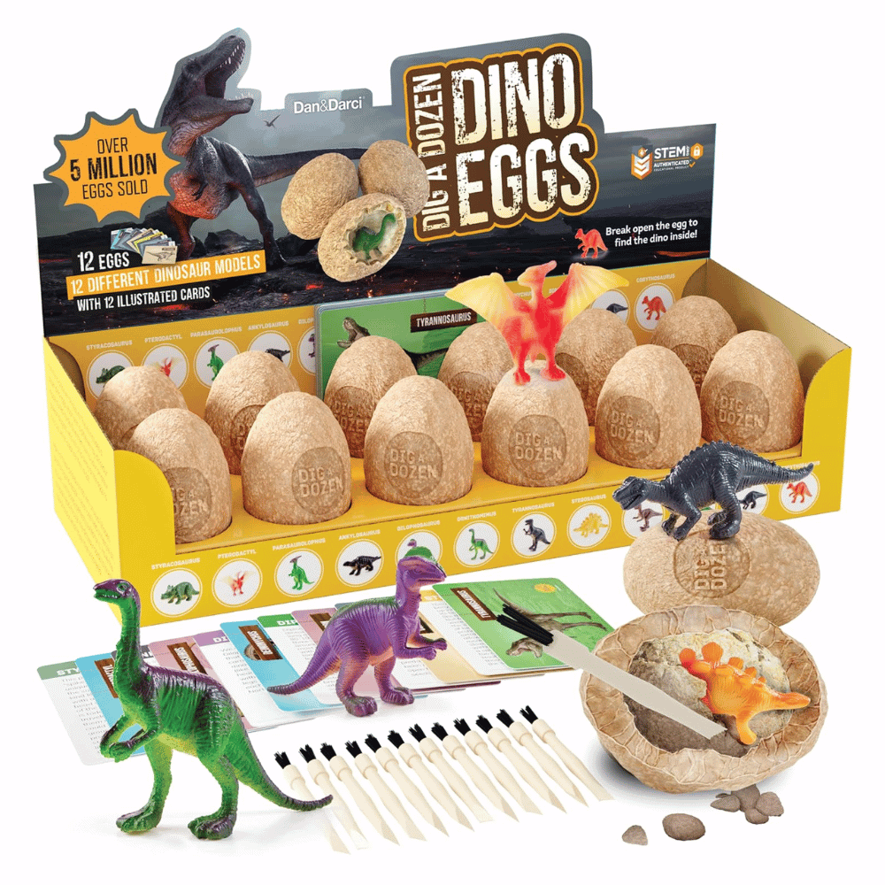 Dig It Up! Dinosaur Eggs Kit includes 12 individually wrapped dig projects, each with its own chiseling tool and instructions. Soak each egg in water, then let your little paleontologist slowly chisel the shell to discover each unique skeleton.