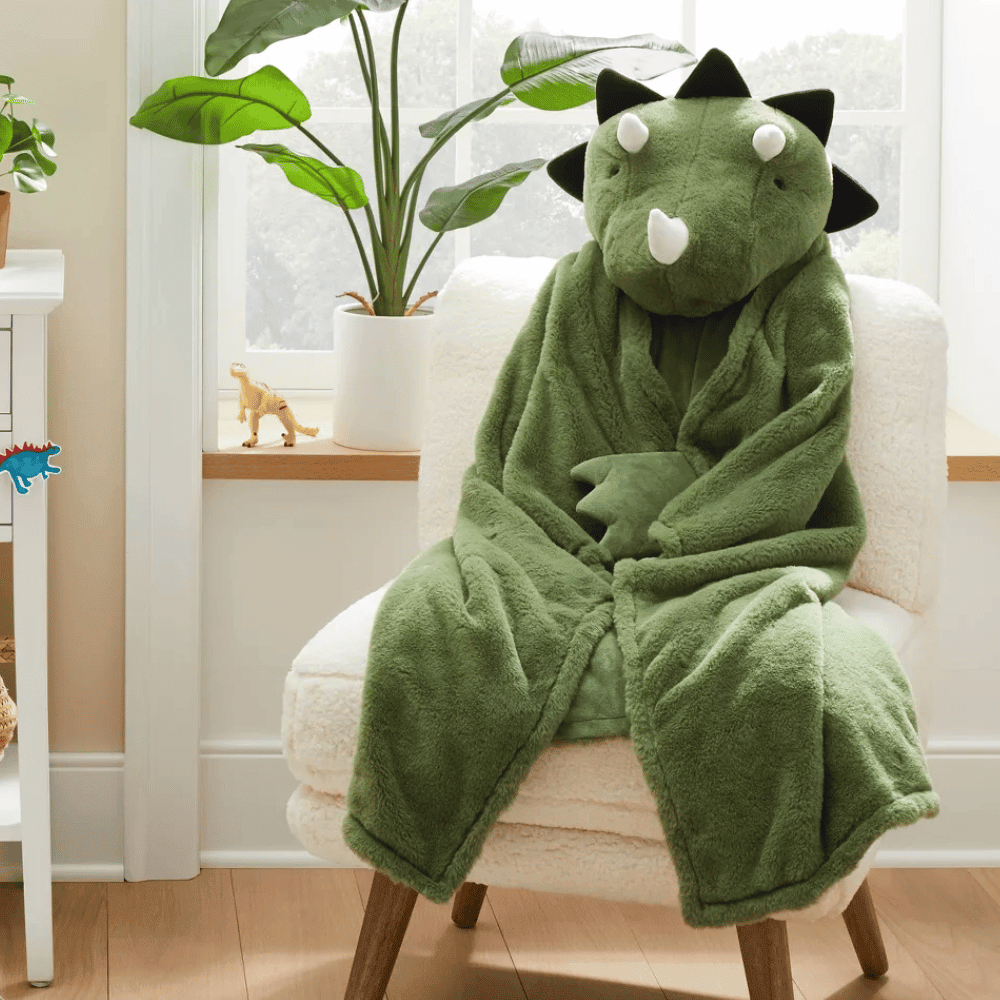 A dino you’ll want to curl up and snuggle with! Made from soft, snuggly fabric, this hooded blanket transforms your little one into the cutest dinosaur around. Perfect for movie nights, bedtime, or stomping around the house in Jurassic style. A must-have for any dino lover who loves to stay warm and roar-ready!