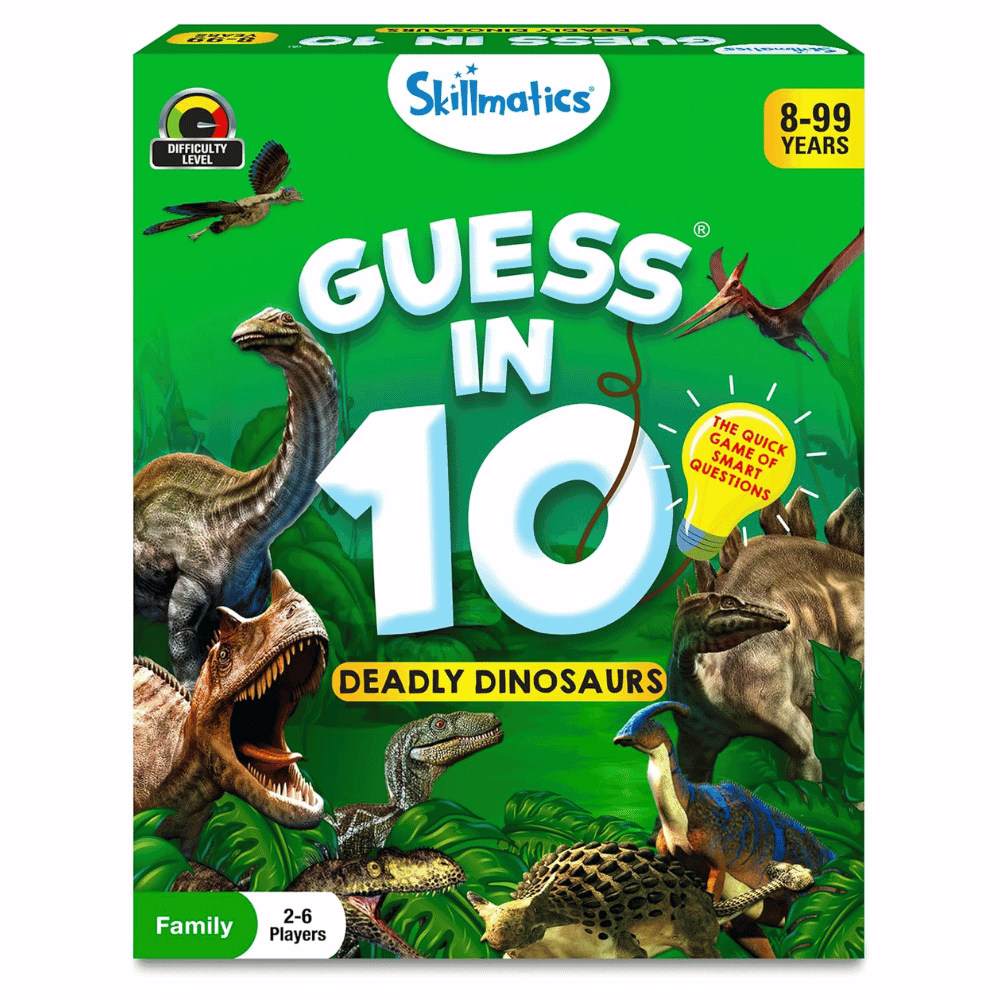 Think you know a lot about dinosaurs? Put your knowledge to the test with Guess in 10 Deadly Dinosaurs! Ask up to 10 questions to correctly guess the dinosaur on the Game Card. Was this dino carnivore? Did this dino have spikes on its back? May the best paleontologist win!