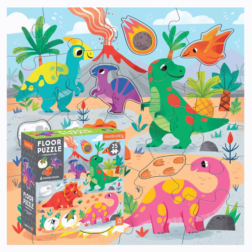 Tiny T-rex-or toddler-sized hands will love to get on the ground and put together this large floor puzzle. Depicting a colorful and imaginative scene of a dinosaur park, this puzzle features 25 jumbo pieces, including six unique dino-shaped pieces!