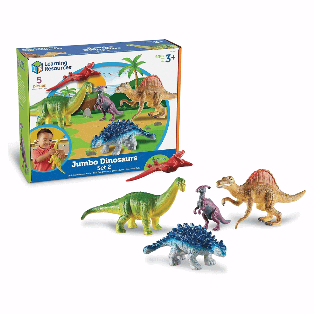 Oversized for little fingers, these jumbo dinosaurs are colorful and realistic. The set has five different dinosaurs and an activity guide, encouraging imagination and creativity.