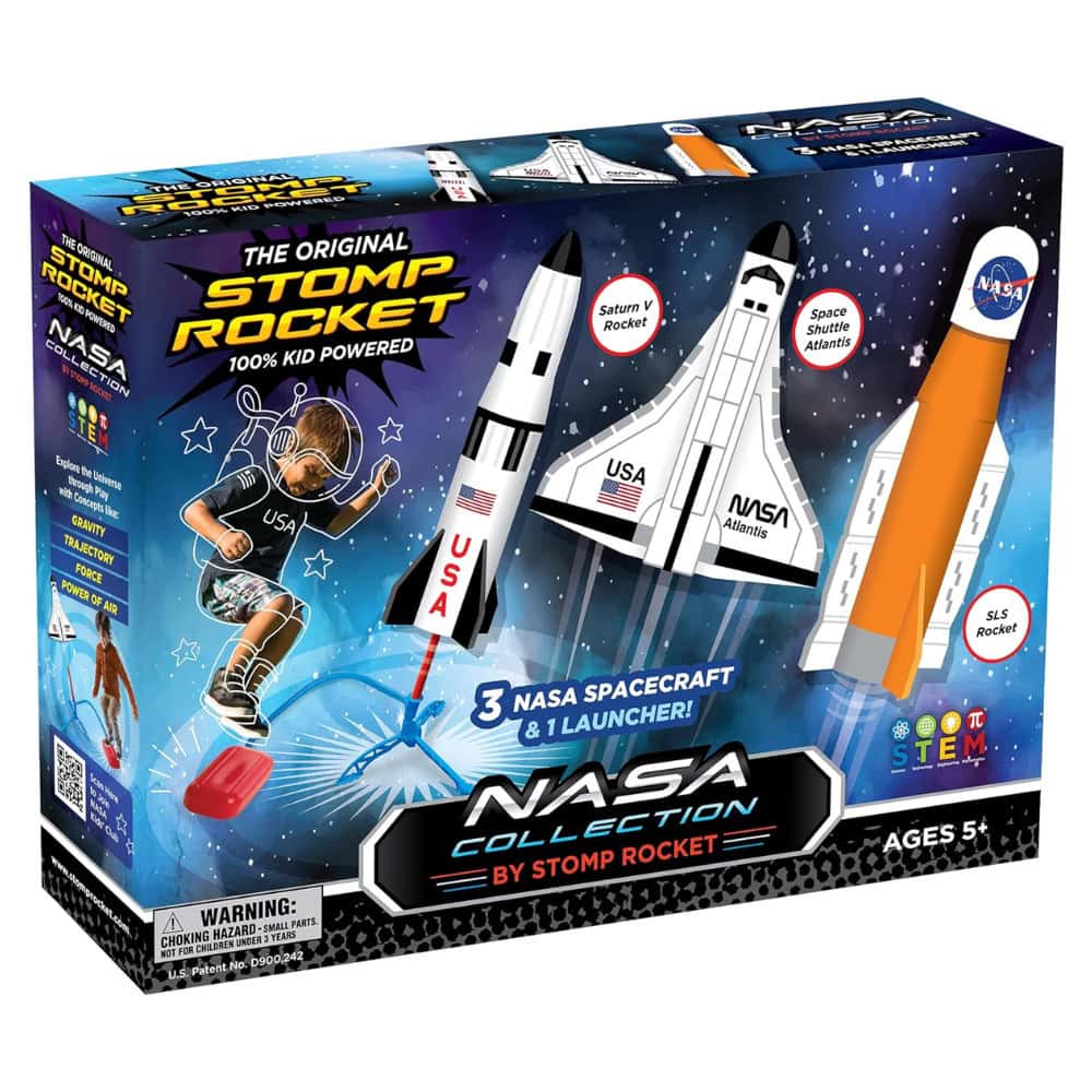 Get ready to launch an adventure with the Stomp Rocket Space Collection! Kids can stomp and blast three NASA rockets—SLS, Space Shuttle Atlantis, and Saturn V—up to 100 feet high!